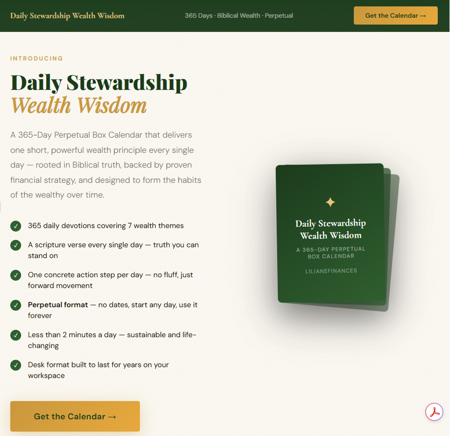 A 365-Day Perpetual Box Calendar that delivers one short, powerful wealth principle every single day — rooted in Biblical truth, backed by proven financial strategy, and designed to form the habits of the wealthy over time.